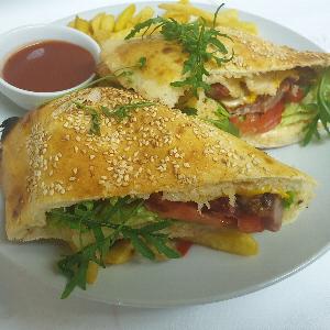 (dimljeni pileći file, dimljeni sir, pavlaka, paradajz, pomfrit)