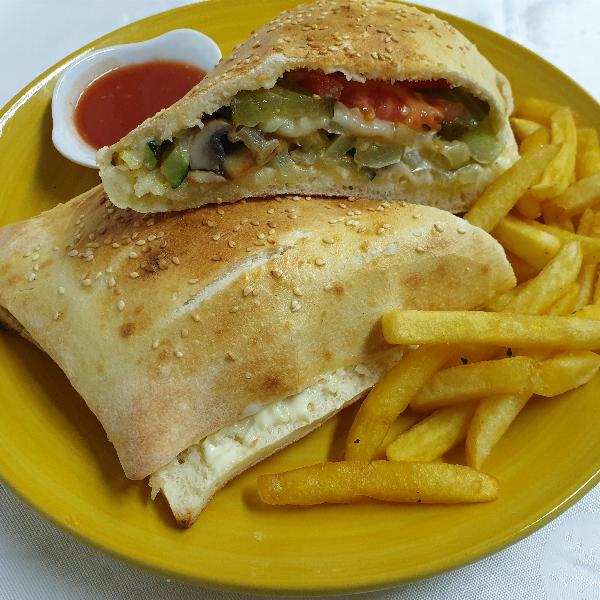 Integralna tortilja, humus sa kikiriki puterom, sotirano povrće, avokado, biljni sir, mix salata, pomfrit