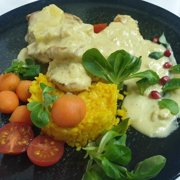 Ćureći medaljoni, sos od šumskih pečuraka, pomfrit, pirinač, brokoli, šargarepa, pirinač sa kurkumom
