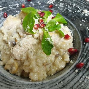 (arborio, pileći file, šampinjoni, šargarepa, pelat, neutralna pavlaka, čili sos, parmezan, crni luk, beli luk)