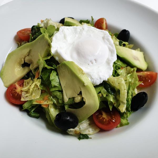 (Zelena salata, rukola, šargarepa, avokado, pesto, poširano jaje, čeri paradajz, limun, maslinovo ulje, peršun, krutoni)